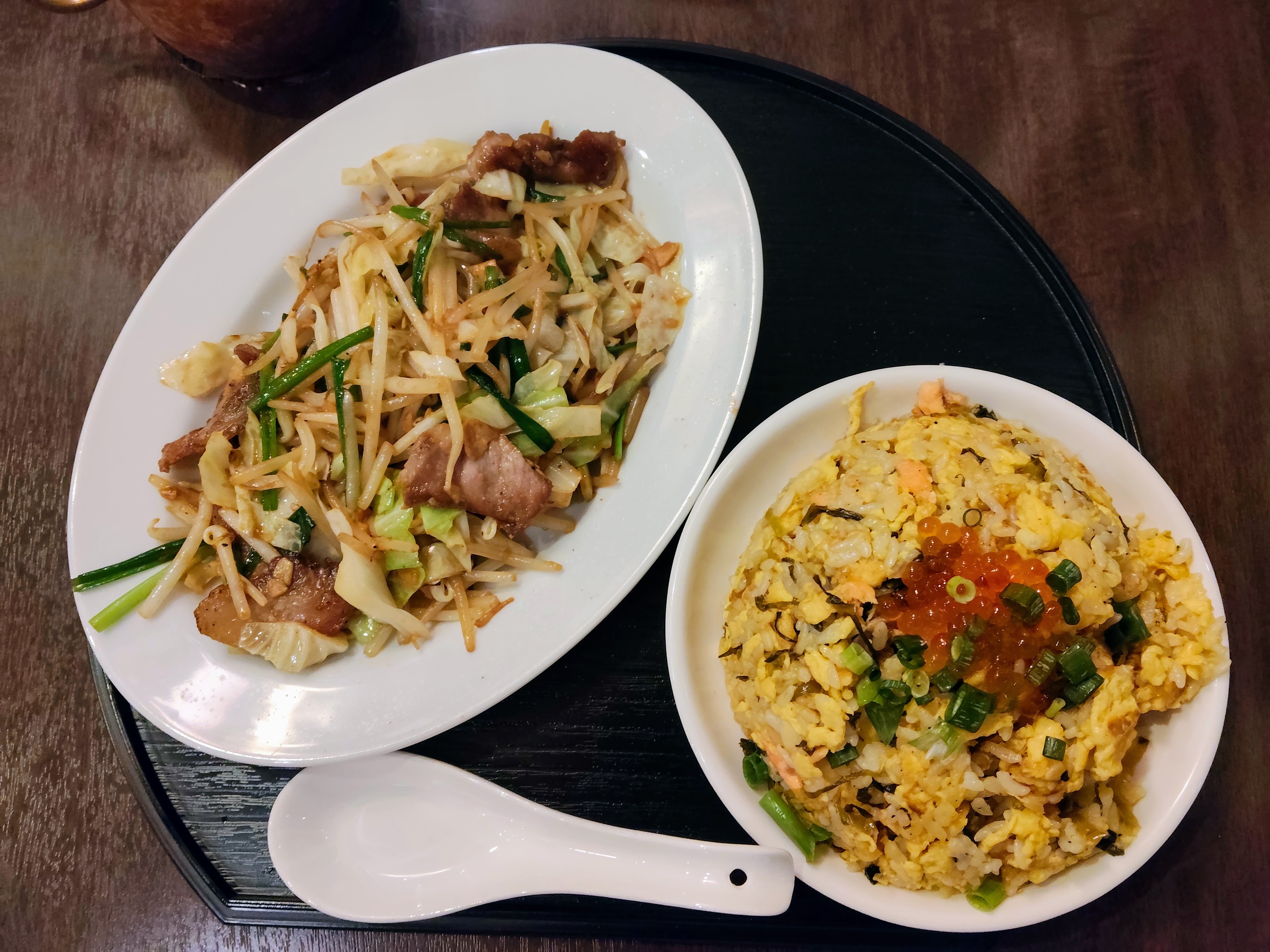 「流石、気づきましたね」というコメントとともに出てきたのは、 肉野菜炒めと鮭いくら高菜チャーハンのセット。
