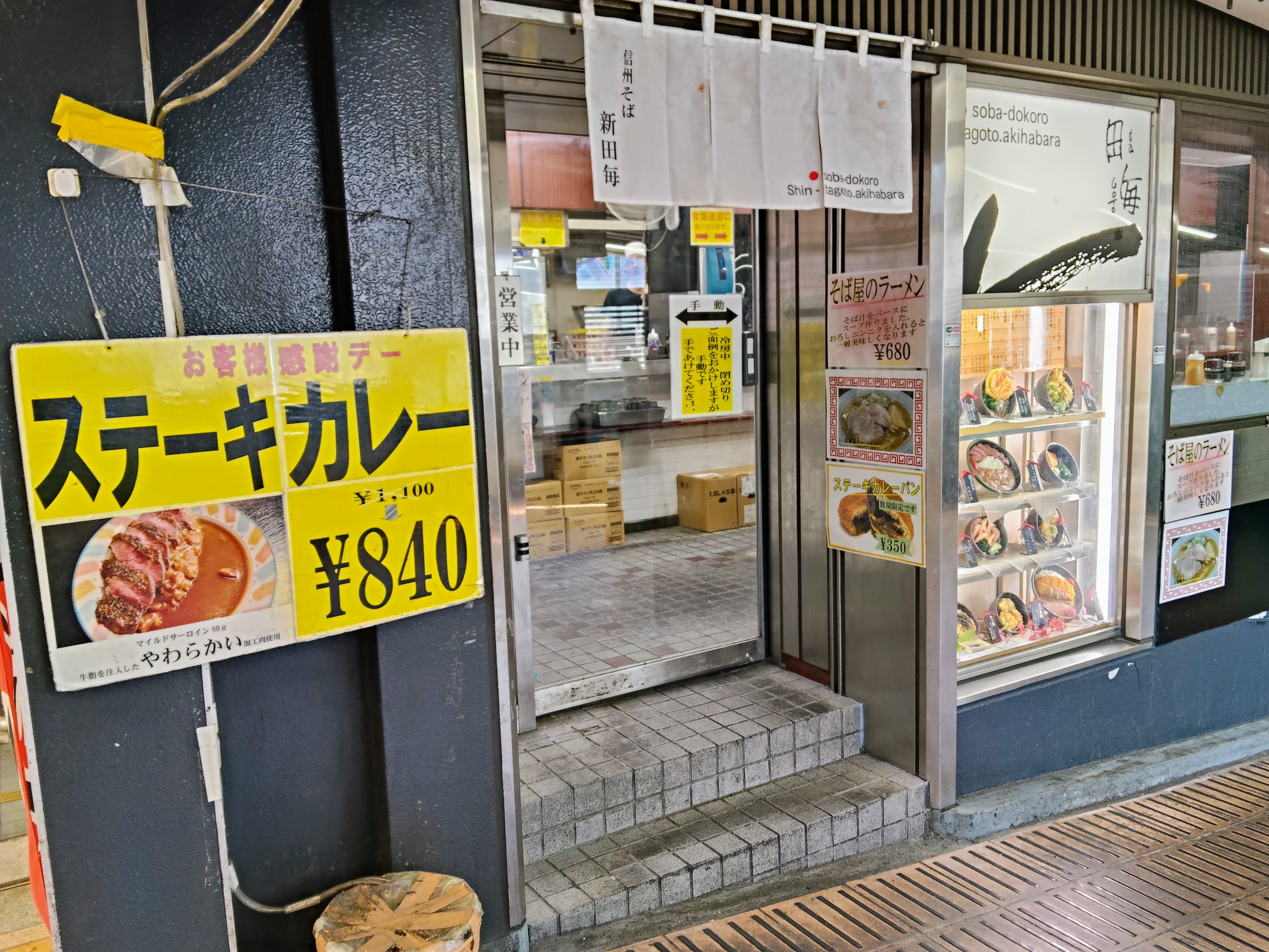 店頭に「ステーキカレー」と大きく書かれていて、どうやら今日はサービスデーだったようですが、初めて来た立ち食いそば屋でステーキカレーでいいのか?と思ってしまい、回避。